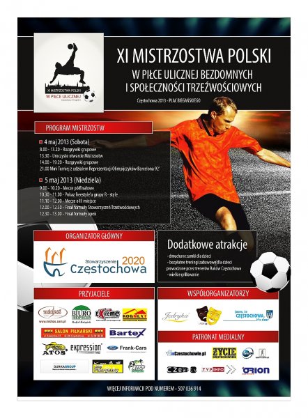 Miło jest na poinformować, że wspólnie z Monar Dębiec oraz Piekarnią Jędryka, organizujemy XI MISTRZOSTWA POLSKI W PIŁCE ULICZNEJ BEZDOMNYCH w dniach 4-5 maja 2013r.